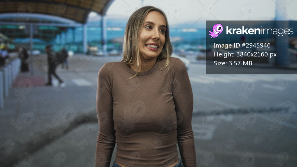 Woman shrugging shoulders with a wry face at airport terminal outdoors by curbside dropoff; awkwardness.