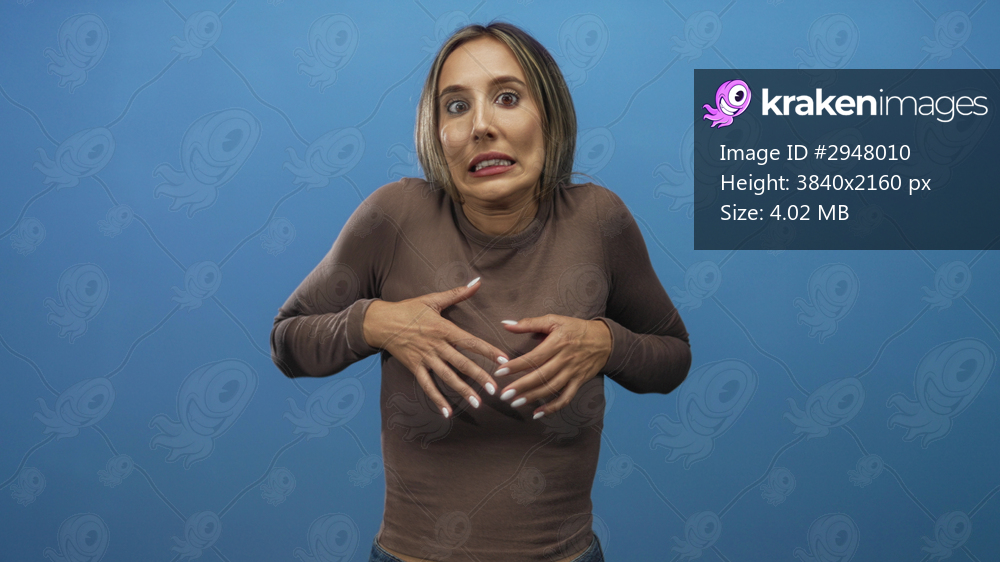 Woman shrugging shoulders with open hands in blue studio, facing camera with puzzled expression and casual brown top; uncertain doubt.
