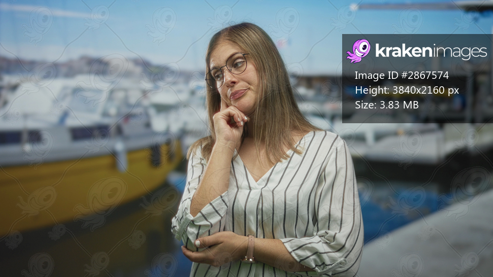 Woman shrugs with both hands open beside a docked boat at a sunny port; uncertainty hesitation doubt.