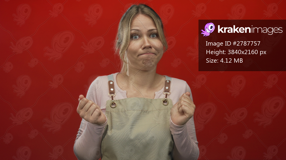 Woman shrugs both hands with raised palms and puzzled expression in professional photo studio; uncertainty confusion.