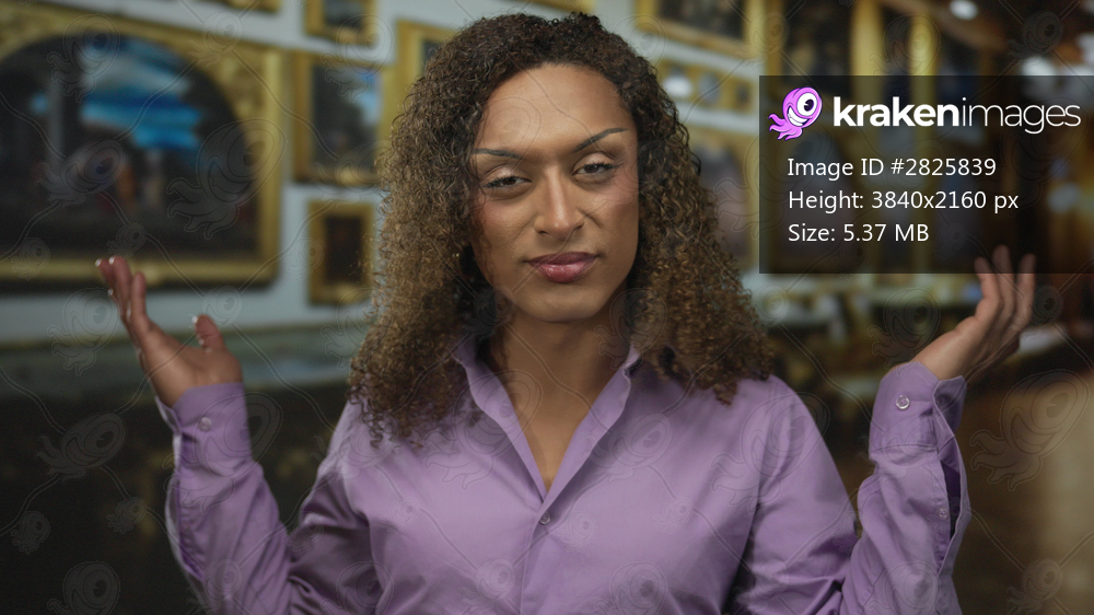 Woman shrugs with hands raised and puzzled expression in museum hall beside framed paintings; uncertainty.
