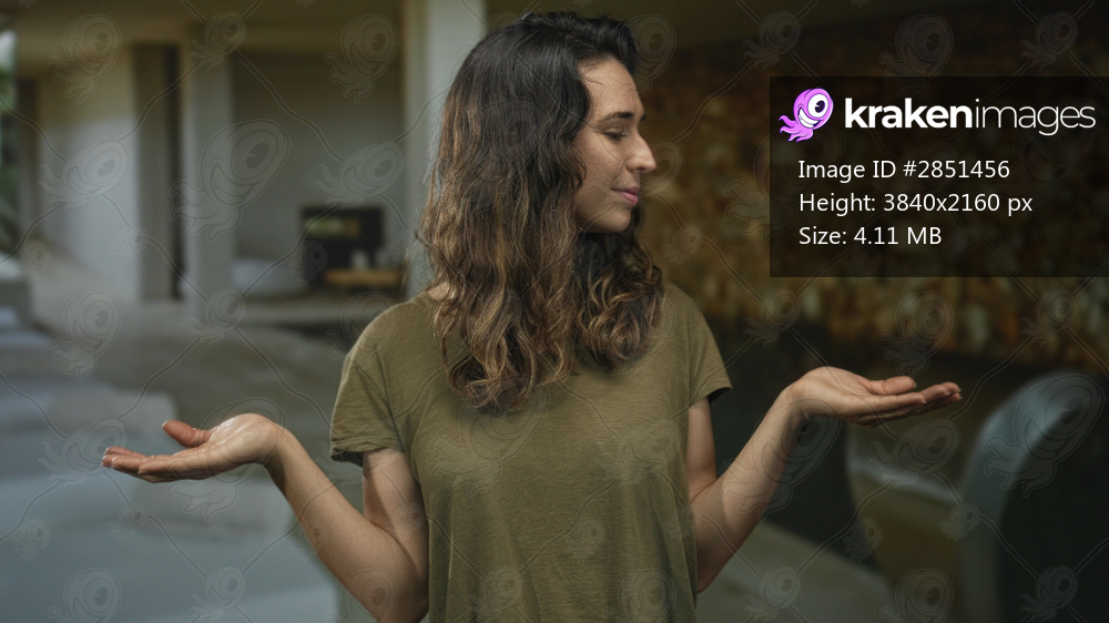 Woman shrugs with palms up by indoor pool in concrete building corridor; uncertainty solitude contemplation.