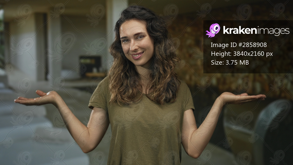 Woman shrugs with palms up by indoor pool in concrete building corridor; uncertainty solitude contemplation.
