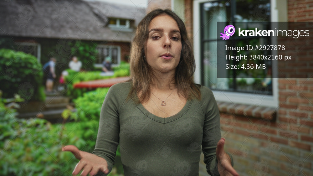 Woman shrugs with palms up and closed eyes at building entrance, wearing necklace; calm contemplation.