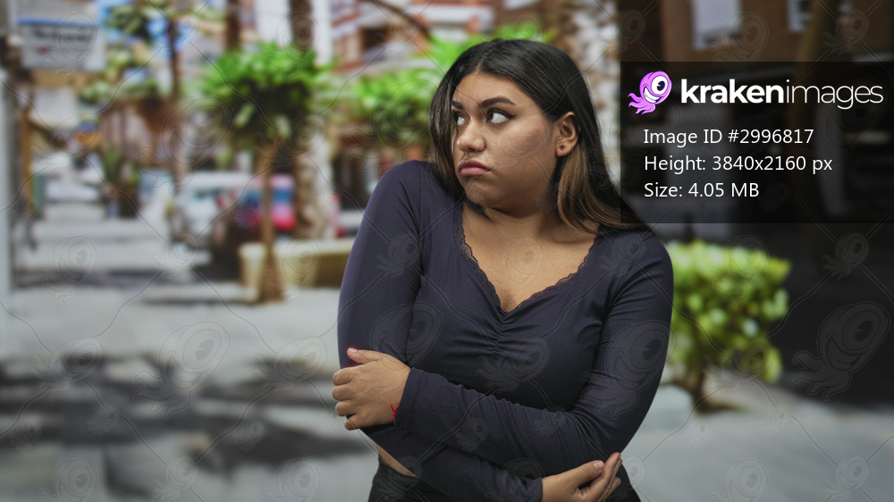 Woman shrugs palms up on a sunlit city street, sometimes crossing arms and rolling eyes; indifference.
