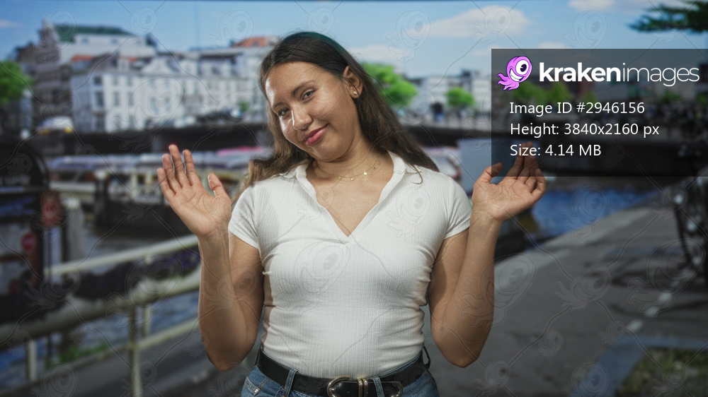 Woman shrugs with palms up on street by amsterdam canal wearing white shirt and jeans, facing camera with light smile; playful doubt.