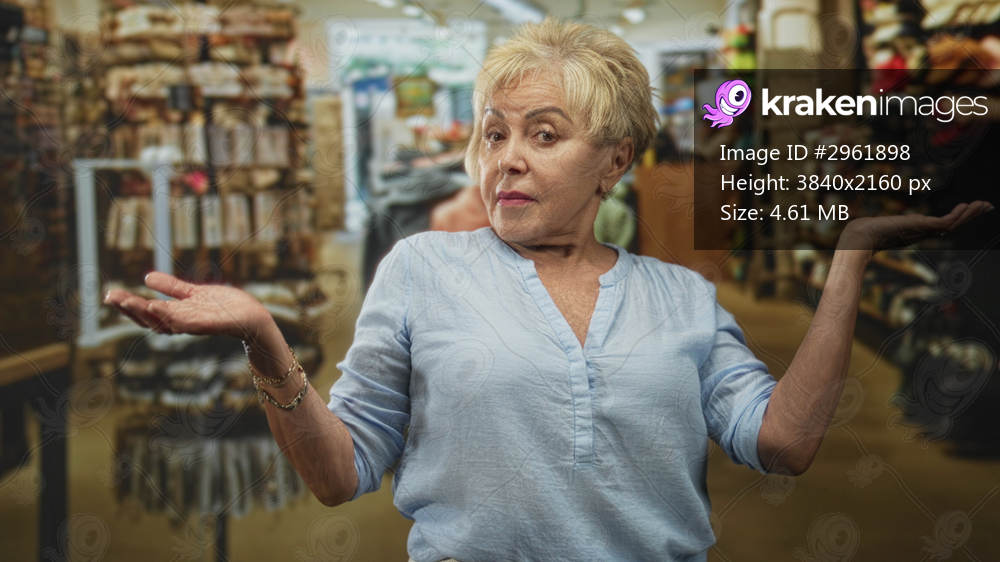 Woman shrugs palms up showing hands and forearms in a shoe store aisle inside a building; uncertainty.