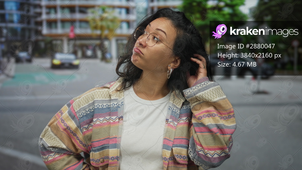 Woman shrugs shoulder and holds hair on street wearing round glasses and patterned jacket; casual indifference.