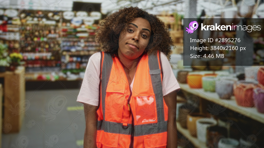 Woman shrugs shoulders in a flower shop building among colorful pots and flowers while wearing an orange safety vest; uncertainty.