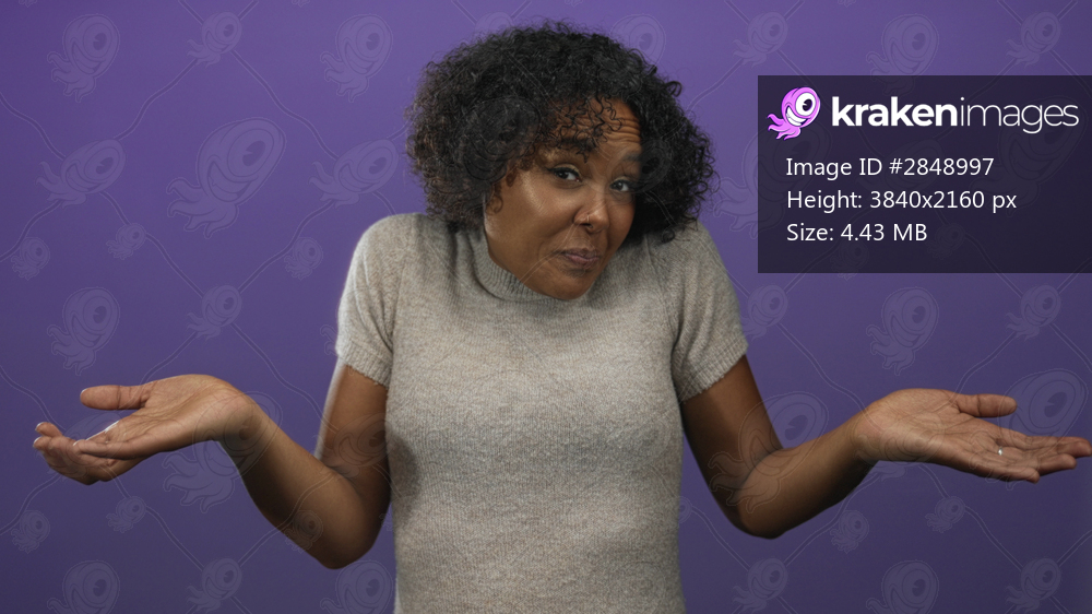 Woman shrugs shoulders in purple studio session captured in medium shot with a puzzled look; uncertainty.