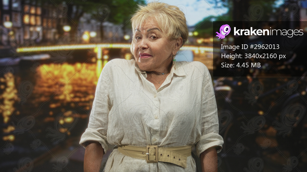 Woman shrugs shoulders on a canal street at night beside parked bicycles and a glowing bridge, wearing linen shirt and wide belt; quiet bemusement.