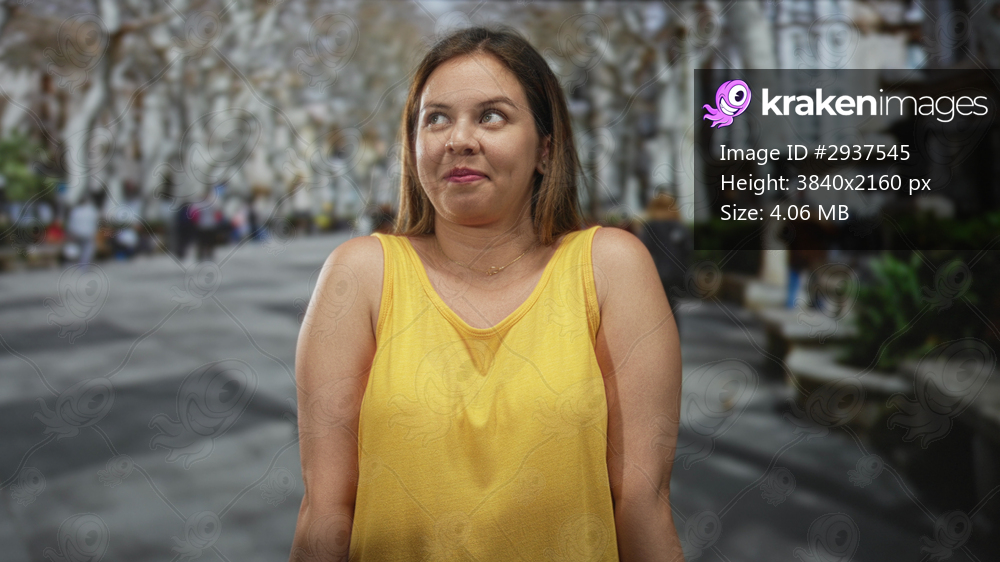 Woman shrugs shoulders on a crowded urban street wearing a yellow sleeveless top, glancing sideways with a sheepish smile; embarrassment.