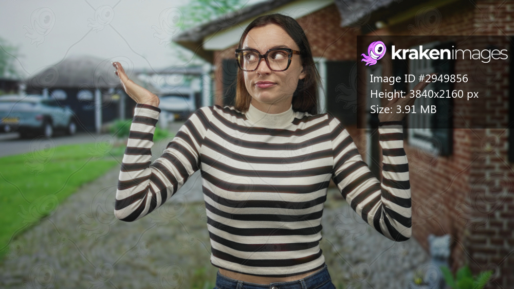 Woman shrugs shoulders with palms up at residential building entrance wearing striped top and glasses, eyebrows raised in a questioning pose; uncertainty. - Kraken Images