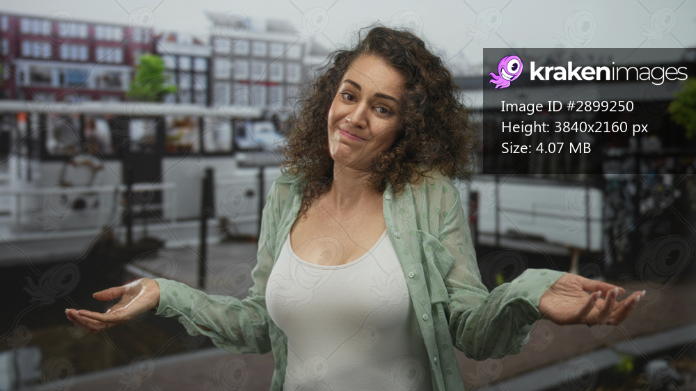 Woman shrugs shoulders with palms up on a street canal in amsterdam near moored boat and quay; mild bemusement.