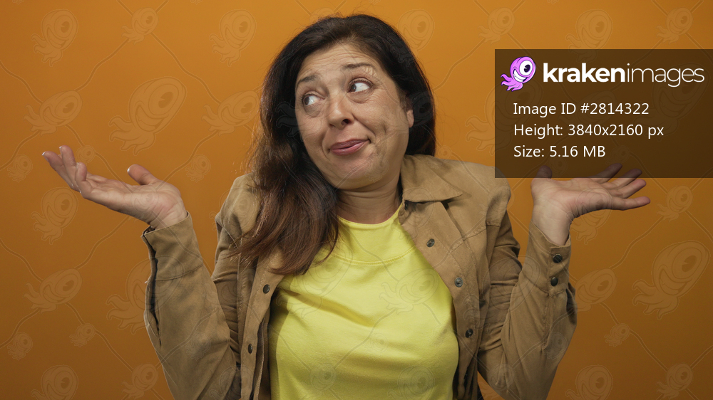 Woman shrugs shoulders and raises hands in orange studio while glancing sideways wearing a casual jacket; uncertainty.