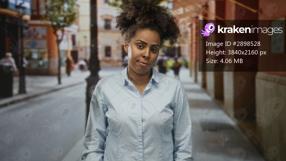 Woman shrugs shoulders and tilts head with eyes closed in a blue shirt on a narrow city street; resignation.