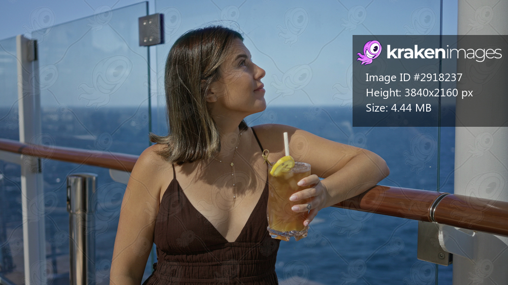 Woman sipping an iced cocktail with straw at cruise ship deck rail, leaning on wooden rail with lemon garnish and glass visible; relaxation.