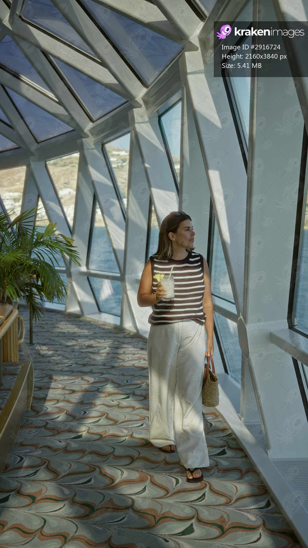 Woman sipping cocktail through straw while holding a straw bag by cruise ship windows in a building; relaxation vacation.