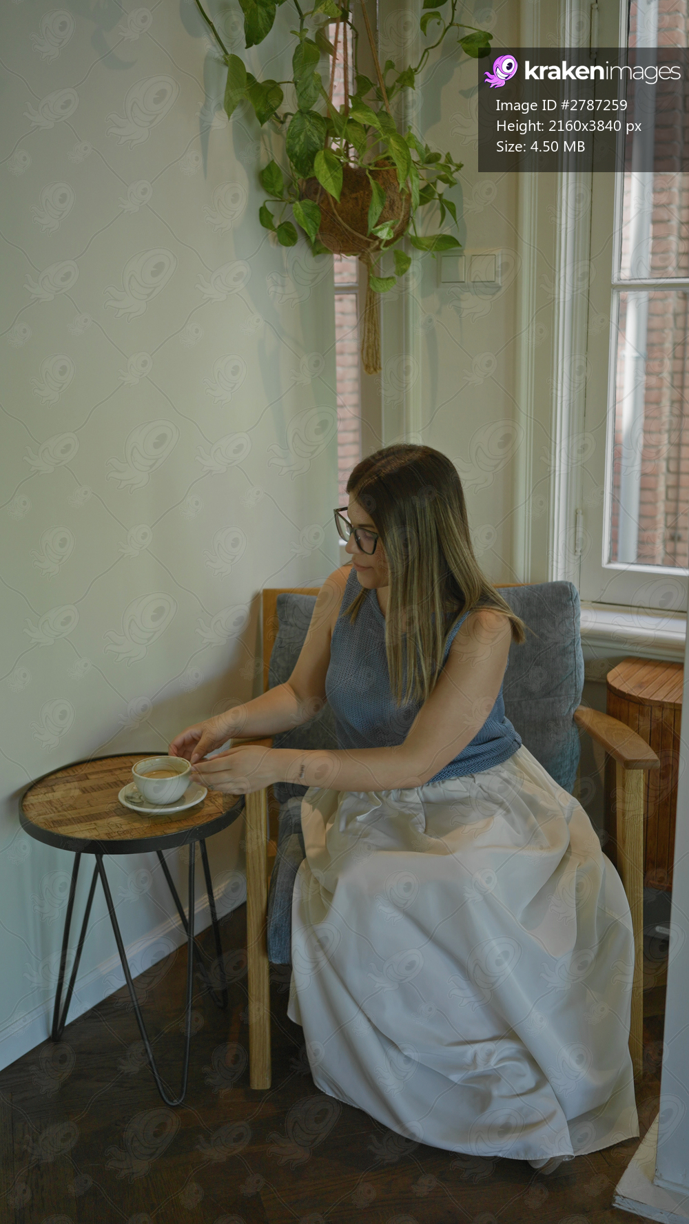 Woman sipping coffee indoors in a cozy cafeteria, seated in a comfortable chair next to a wooden side table and a hanging plant, enjoying a peaceful moment. - Kraken Images