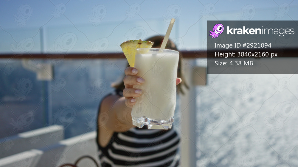 Woman sipping creamy cocktail through a straw on a cruise terrace, holding glass with pineapple garnish, wearing sunglasses and a striped knit; relaxation leisure vacation. - Kraken Images