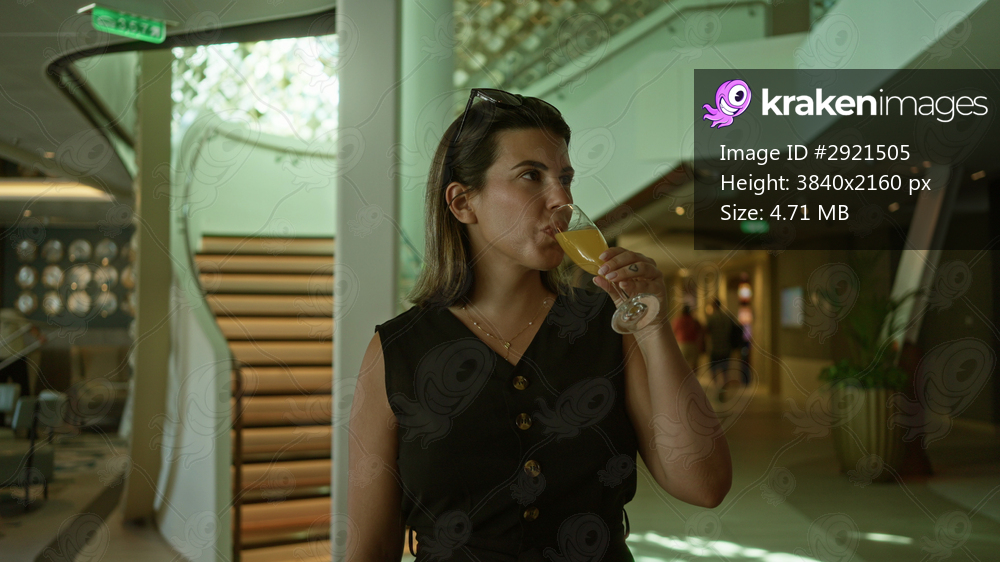 Woman sipping orange juice from glass in building lobby corridor by spiral staircase and lounge seating, holding glass near chest; relaxed.