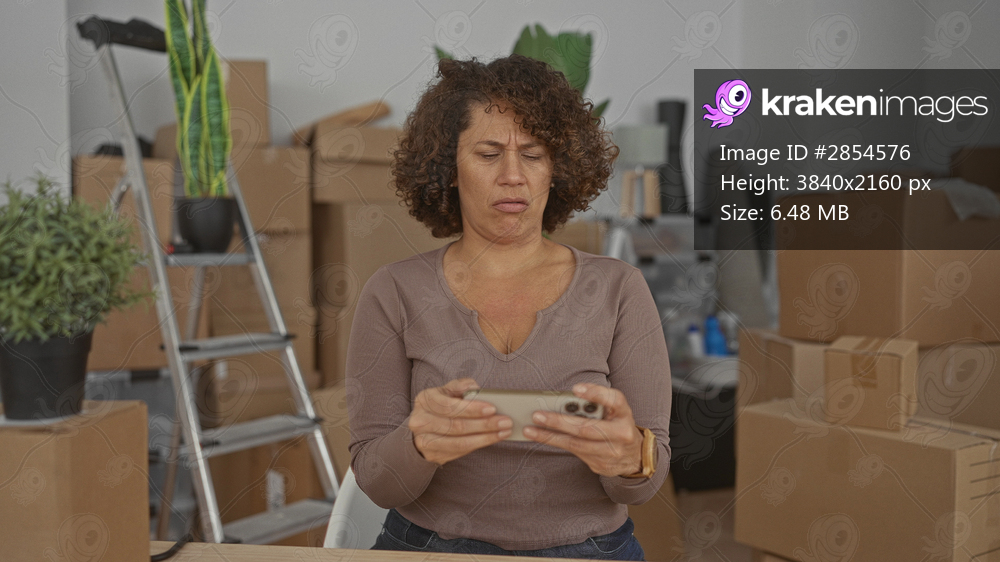 Woman sits at table amid unpacked boxes and scrolls smartphone in new house; moving stress frustration.
