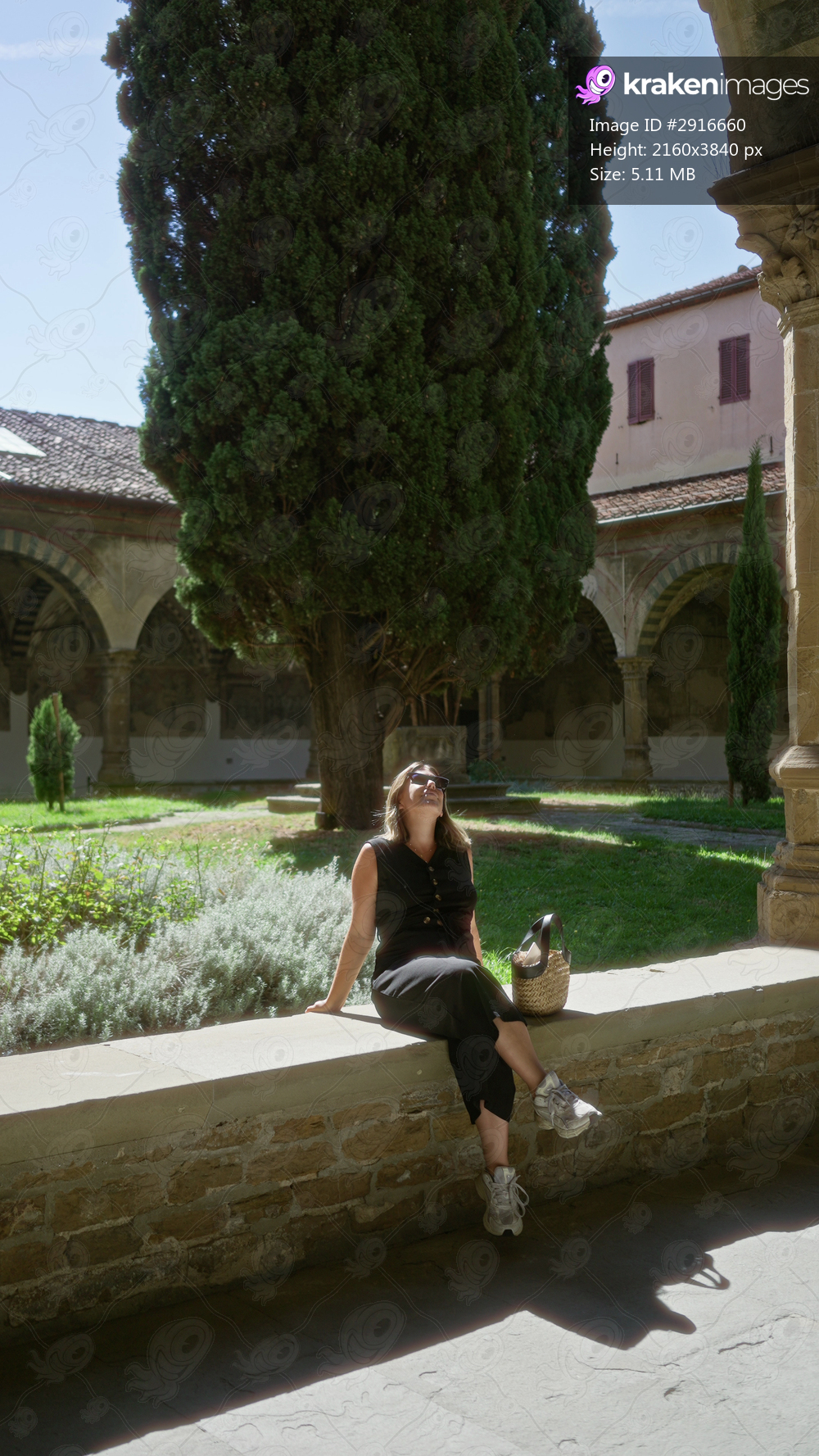 Woman sits on a stone cloister ledge in building, looks up toward the sky wearing sunglasses, a black dress and sneakers, with a woven basket bag beside her; serenity. - Kraken Images