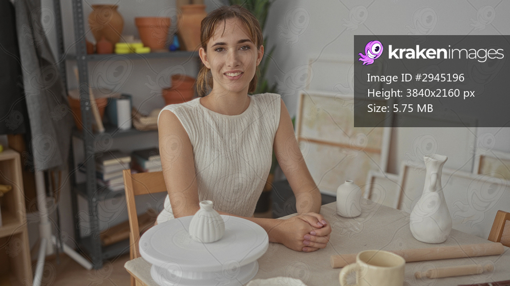 Woman sits smiling with hands clasped on table beside ceramic vases, pottery wheel, rolling pin and canvases in studio; serenity creative focus.