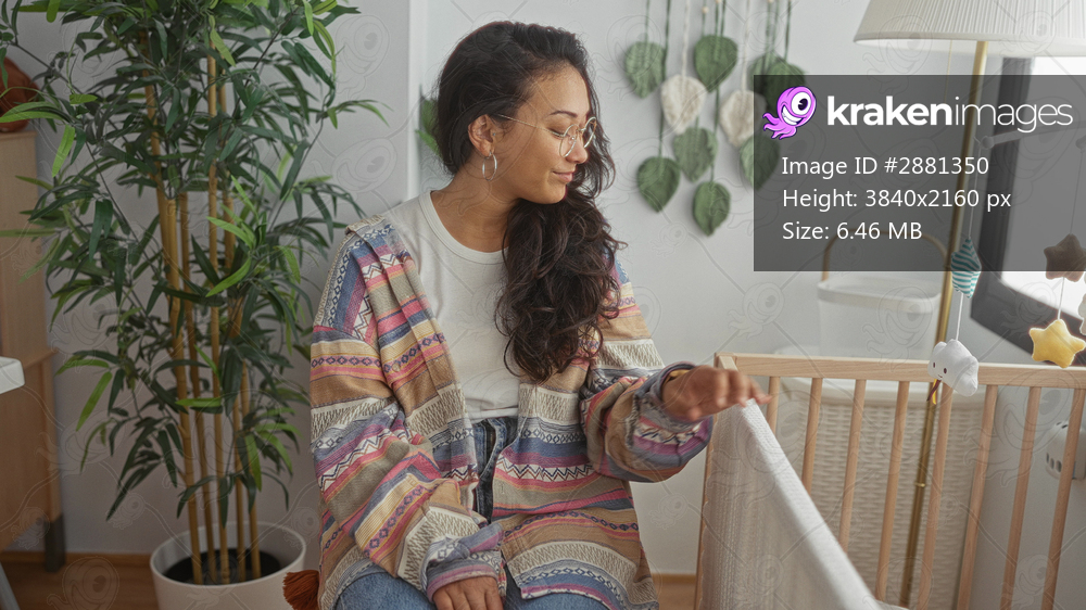 Woman sits smiling and reaches toward wooden crib near a houseplant in a baby room inside a building; maternal contentment.