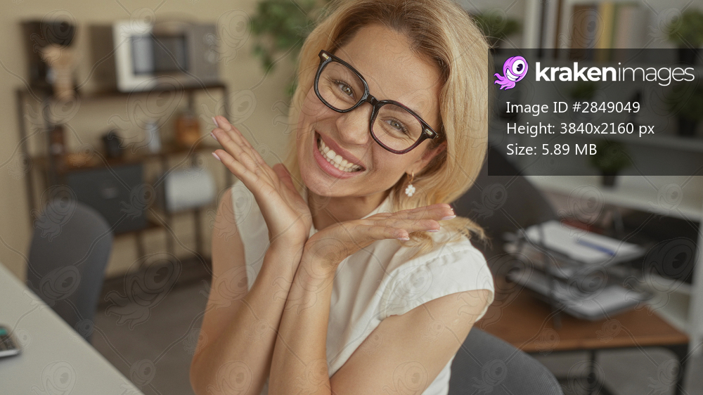 Woman sitting at desk frames face with hands in office building wearing white blouse; sincere playful joy.