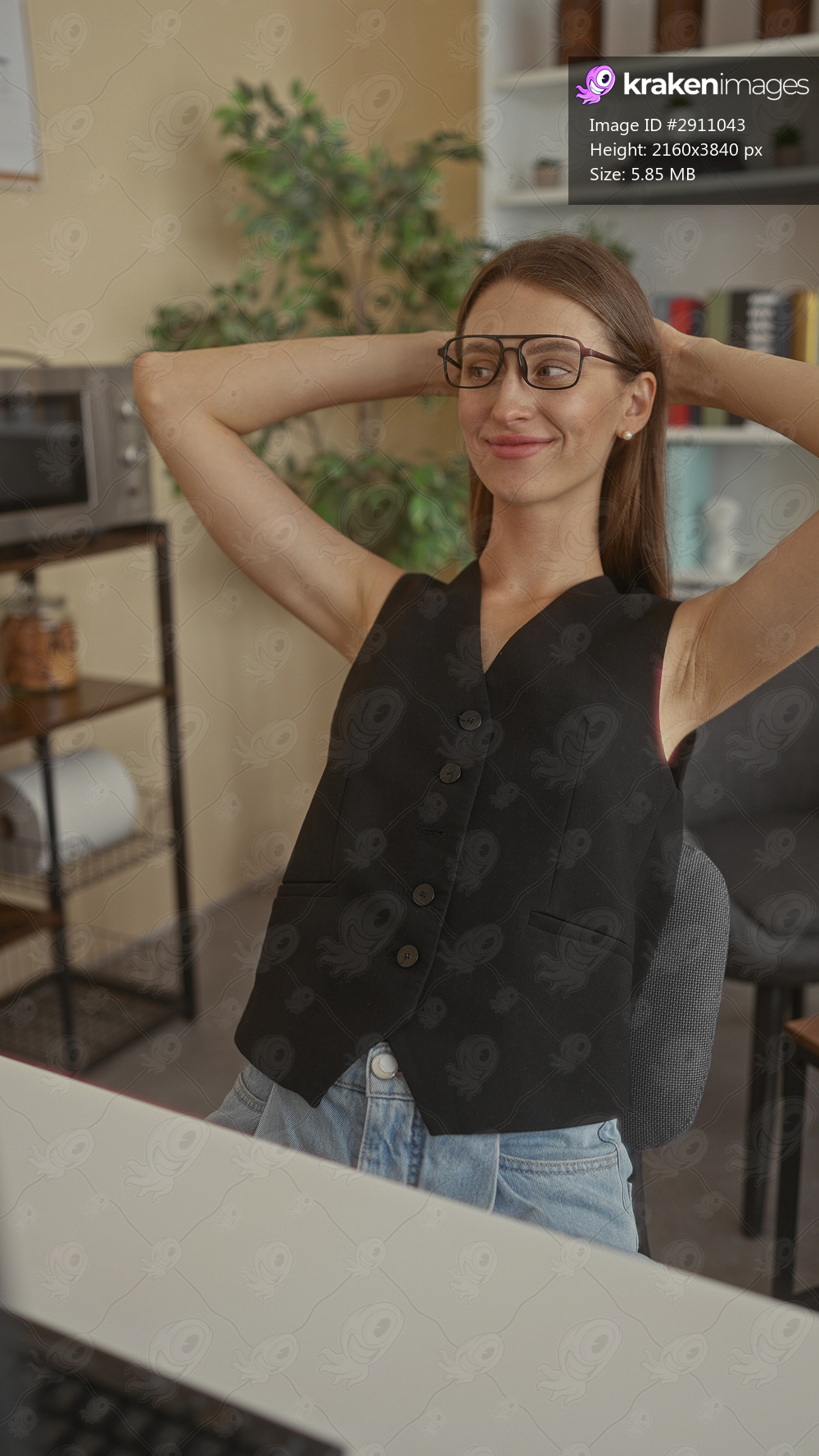 Woman sitting at desk with hands behind head and glasses leaning back facing monitor in office; relaxed productive focus.