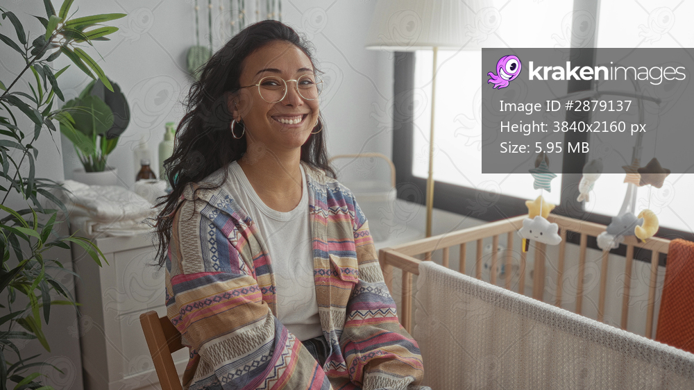 Woman sitting by wooden baby crib in building, wearing glasses and patterned cardigan, hands folded and gazing at window; motherhood reflection serenity. - Kraken Images