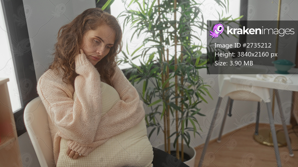Woman sitting in cozy living room with potted plant, wearing a soft sweater while holding a cushion, suggesting a peaceful and relaxed indoor setting.