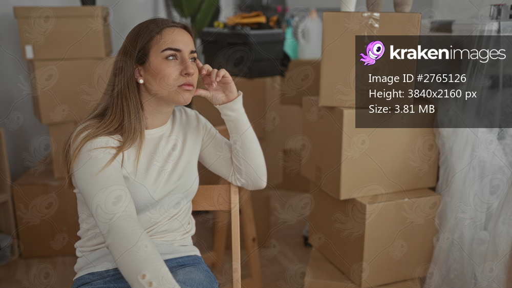 Woman sitting in new home surrounded by cardboard boxes, contemplating moving process in a bright, modern interior, reflecting on journey, unpacking belongings in fresh space. - Kraken Images