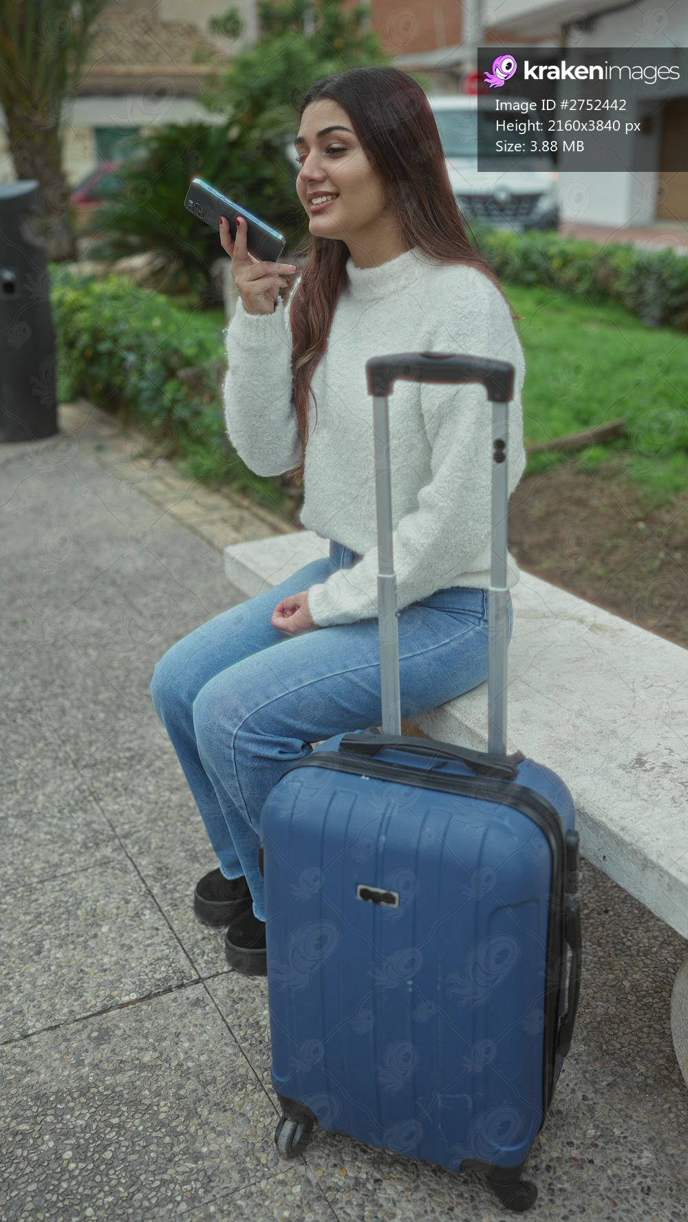 Woman sitting in park talking on phone near luggage with greenery in background.