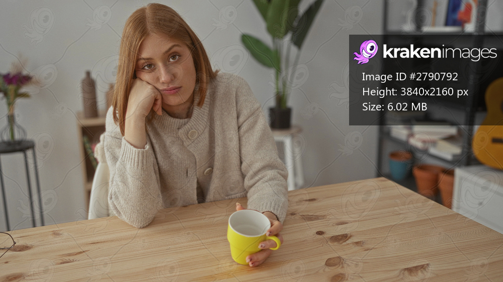 Woman sitting indoors holding a yellow mug, wearing a cozy sweater, looking thoughtful in a modern living room with shelves and plants in the background - Kraken Images