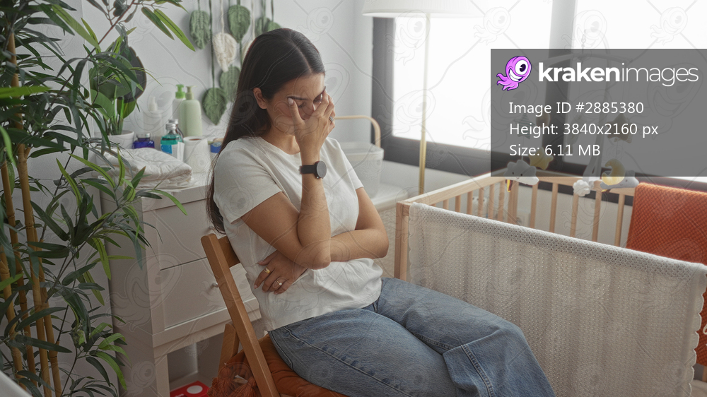 Woman sitting on chair with hand to face and arms folded beside wooden baby crib and hanging mobile in building; exhaustion new parent.