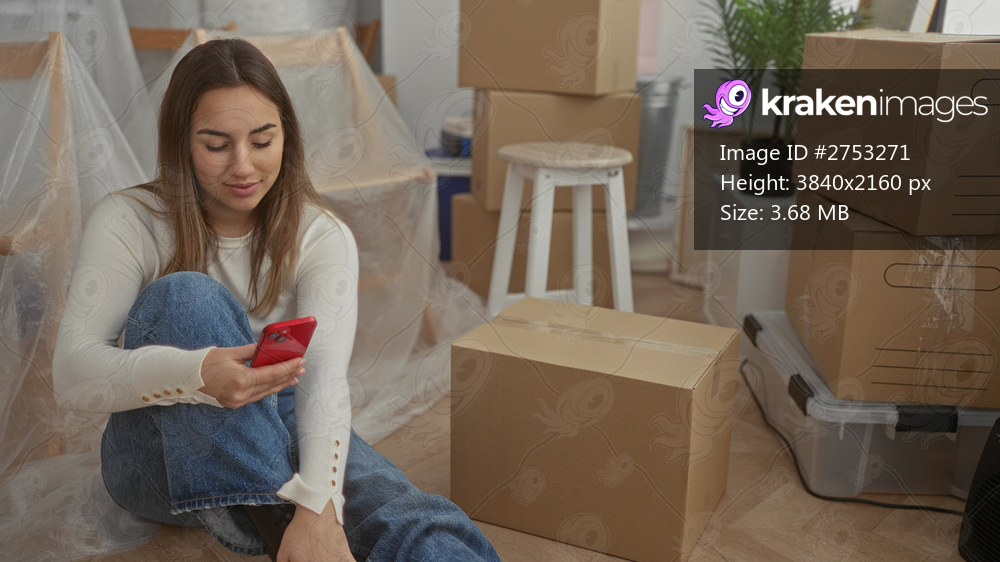 Woman sitting on floor with smartphone surrounded by moving boxes in new home interior, portraying a young and relaxed atmosphere.