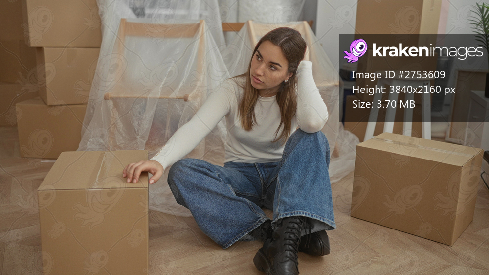 Woman sitting on floor surrounded by packing boxes in new home showing unpacking process and sense of moving transition.