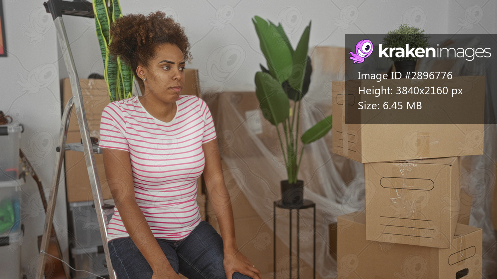 Woman sitting on ladder with arms crossed beside stacked moving boxes and wrapped furniture covered in plastic in building; moving transition frustration. - Kraken Images