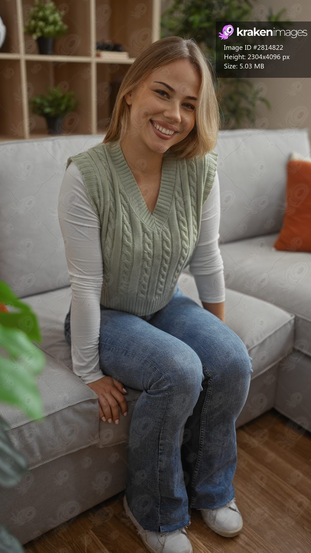 Woman sitting on sofa leaning slightly forward with hand resting on knee and smiling softly in living room; serenity.