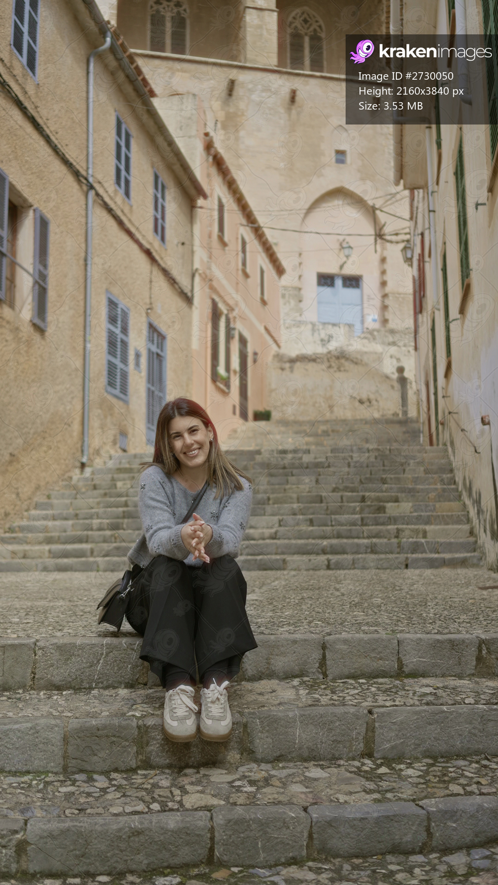 Woman sitting on stone steps in old mediterranean town of mallorca, wearing casual outfit, smiling, surrounded by historic architecture under sunny weather. - Kraken Images
