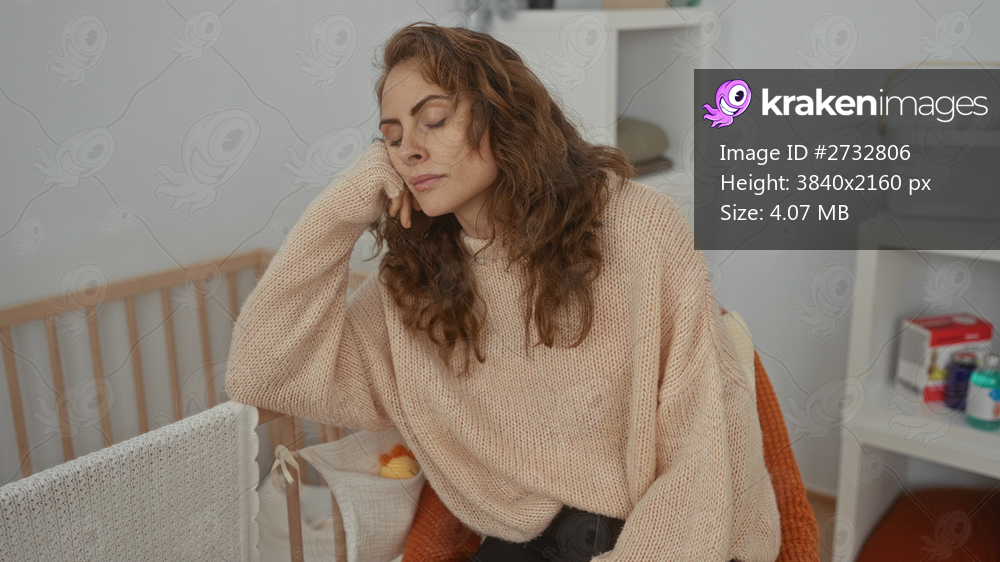Woman sitting tired in bedroom with baby crib nearby in cozy home interior wearing sweater with closed eyes indoors.
