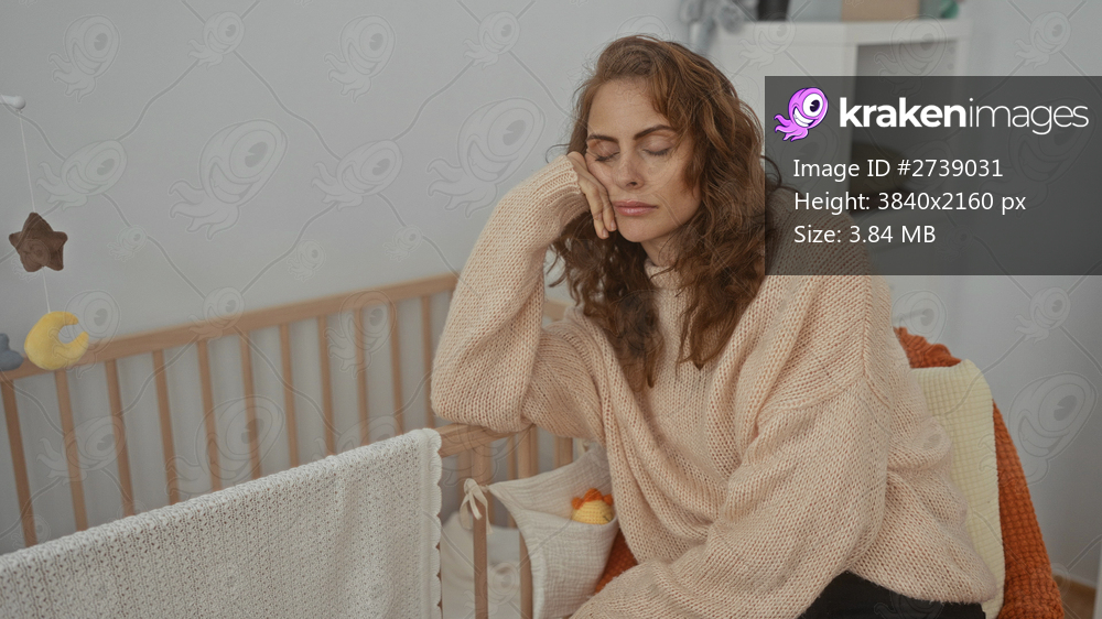 Woman sitting tired in bedroom with baby crib nearby in cozy home interior wearing sweater with closed eyes indoors.