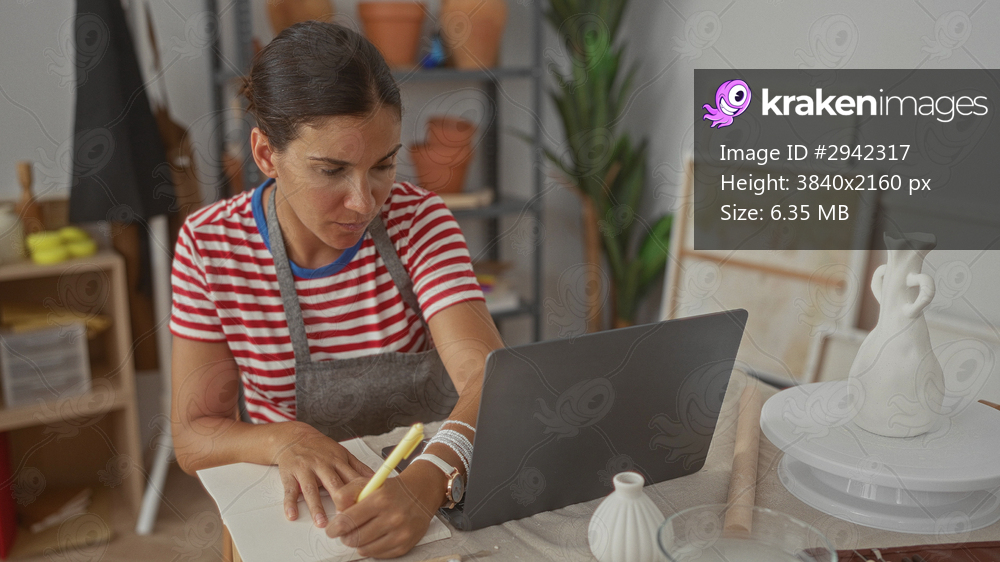 Woman sketching with pencil, hand on sketchbook at pottery studio table with laptop and vases; craft concentration.