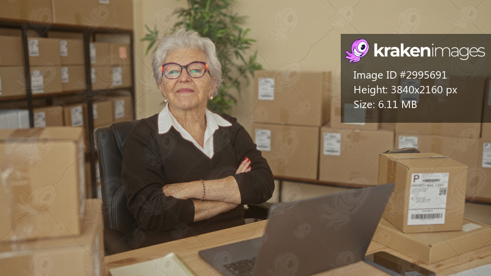 Woman small business owner with boxes at packing desk, laptop and smartphone visible, arms crossed and smiling in building; quiet confidence.