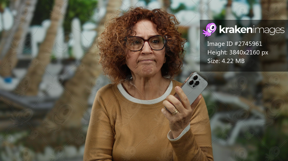 Woman with smartphone by resort pool wearing casual clothes with curly hair reflects modern technology use in outdoor hotel setting staying connected.