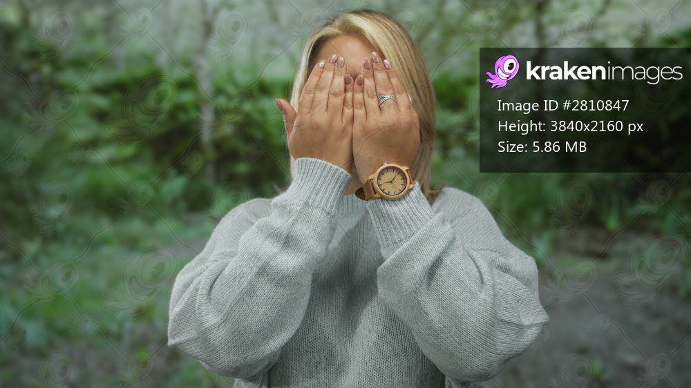Woman smiles as she hides face with hands then lifts open palms in a green park on a sunny day; playfulness.