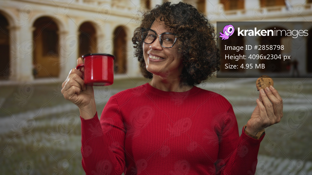 Woman smiles as she holds red mug and chocolate cookie in historic building courtyard of old town; happiness.