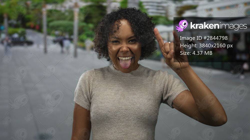 Woman smiles at camera with bare shoulders on busy urban street; happiness openness warmth confidence.